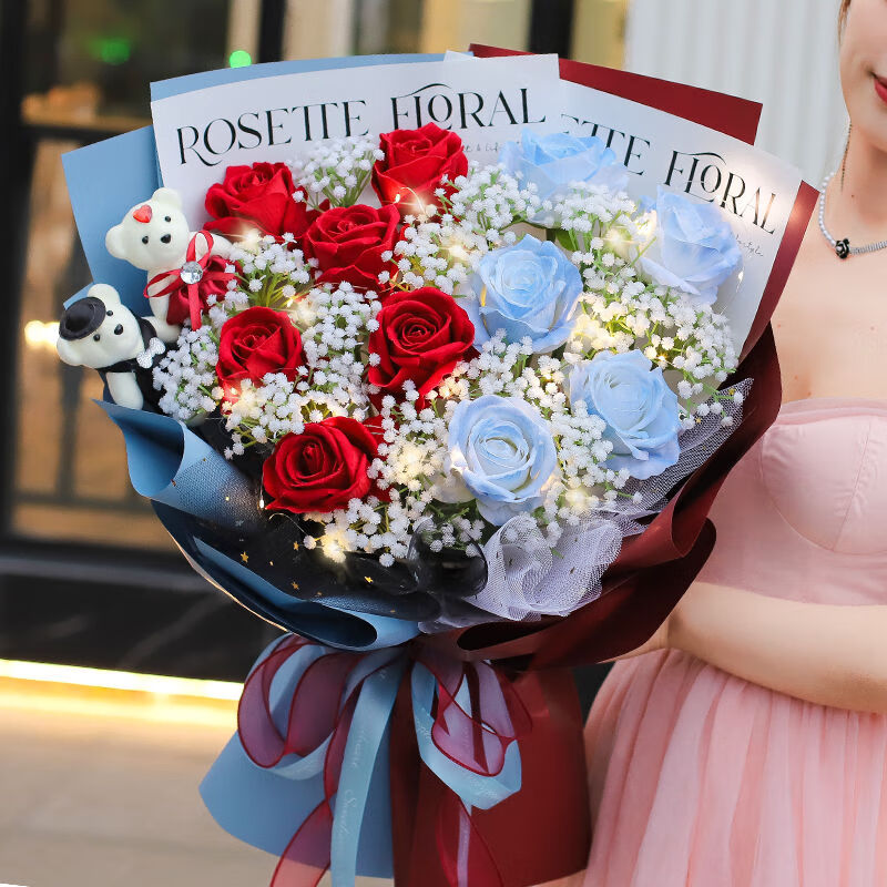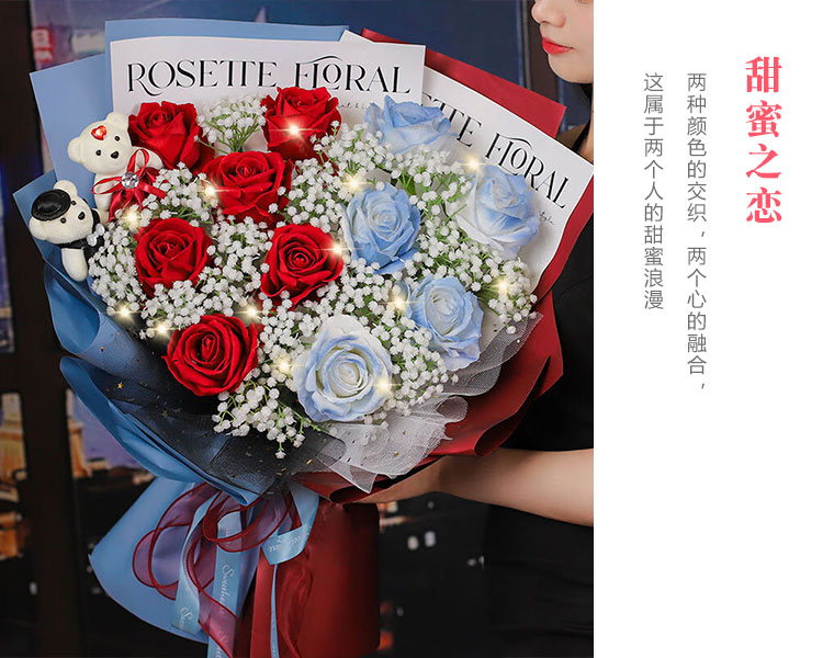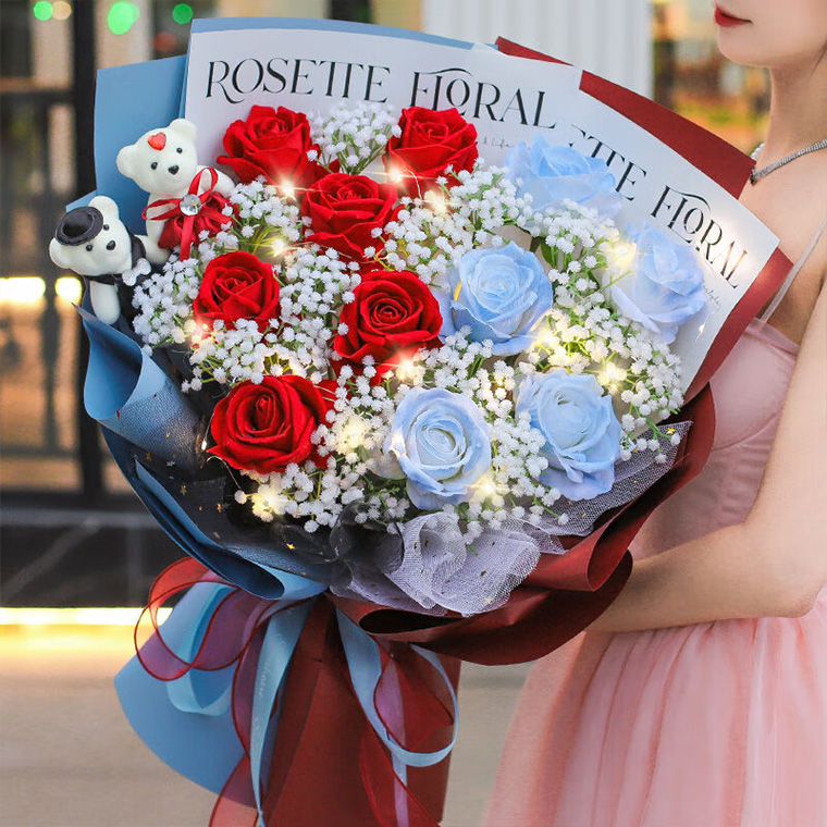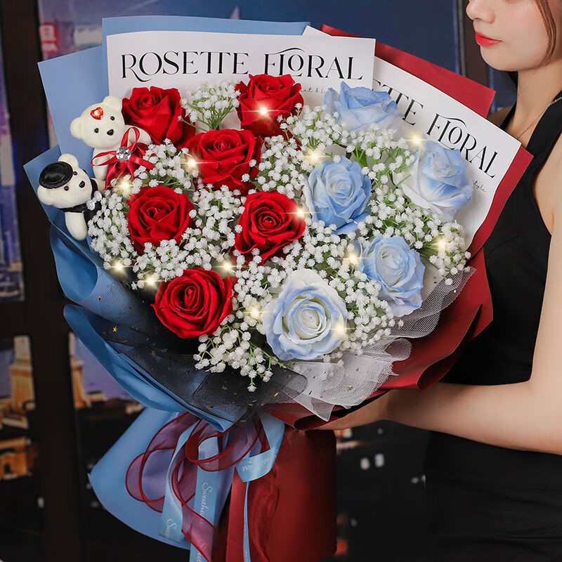 5枝碎冰蓝玫瑰、6枝红玫瑰