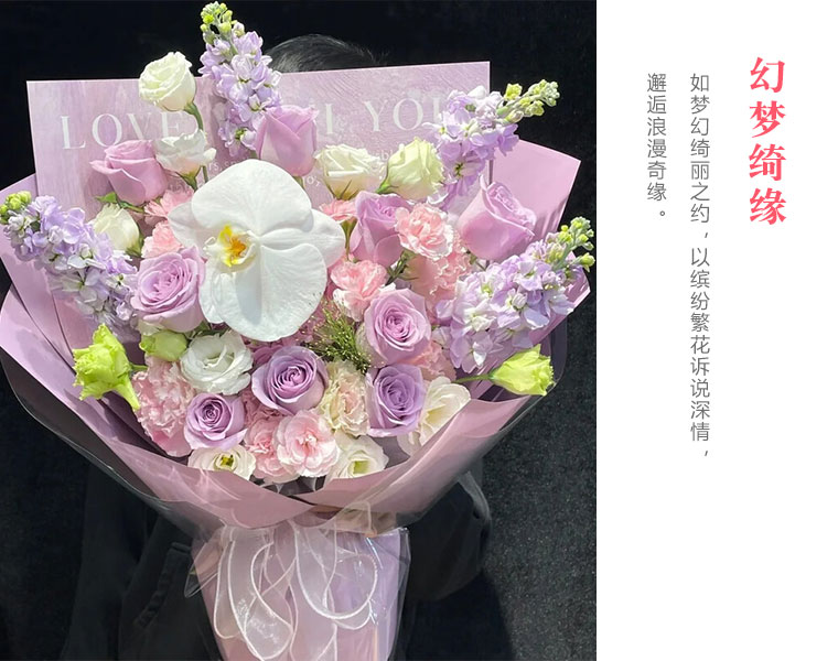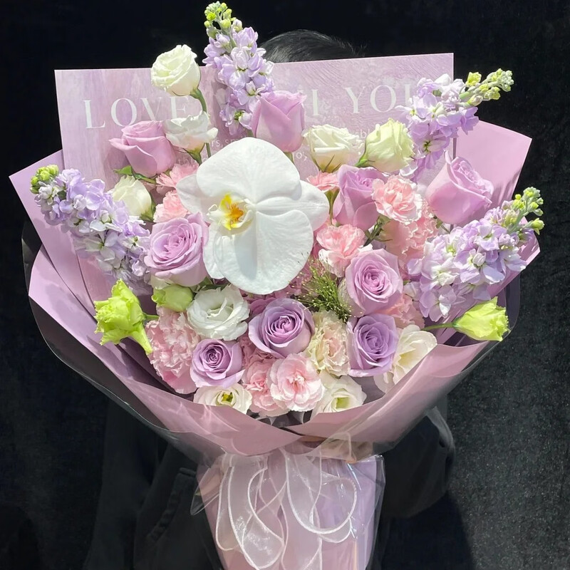 1支蝴蝶兰,9支紫色玫瑰,4支紫罗兰,9支粉色康乃馨